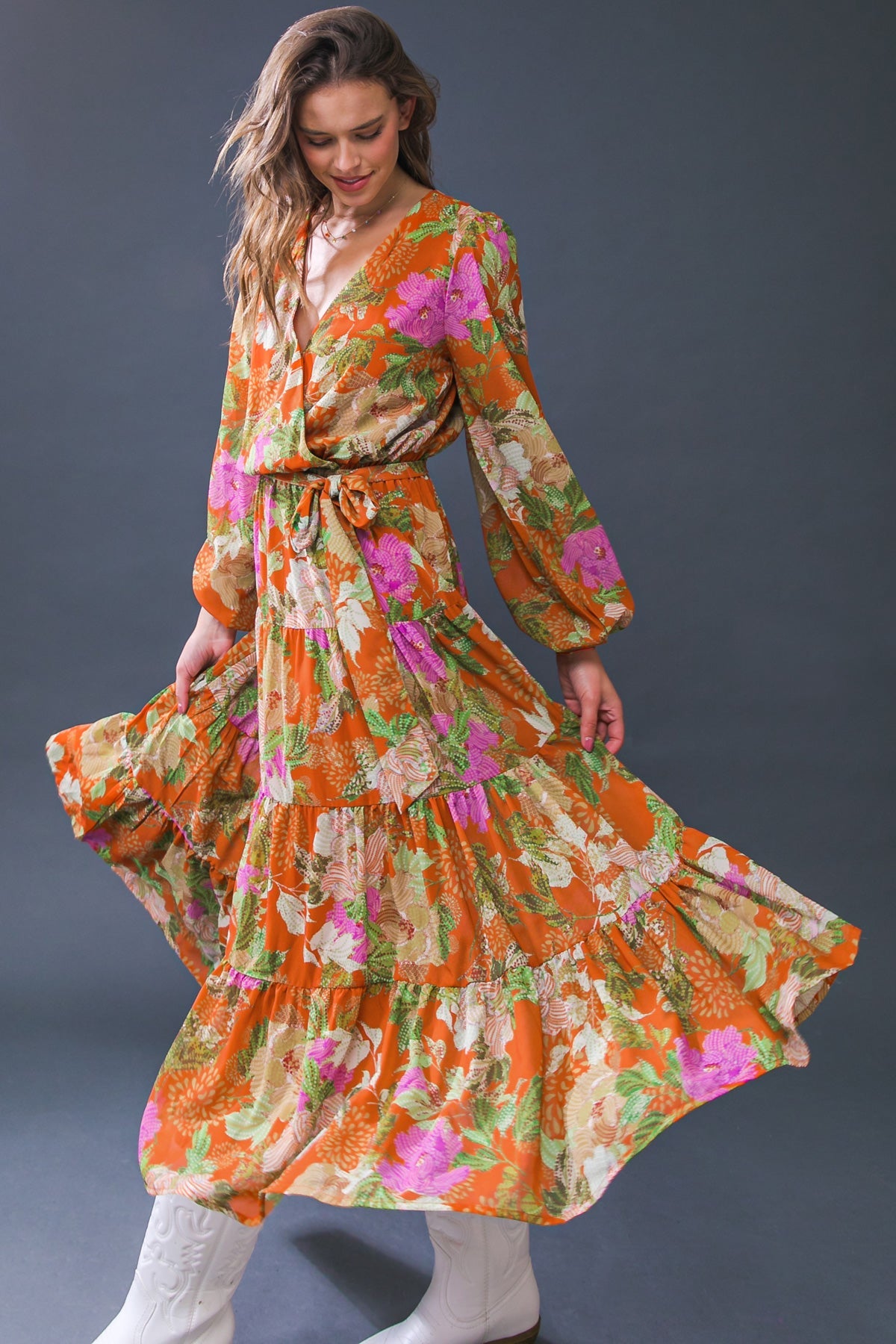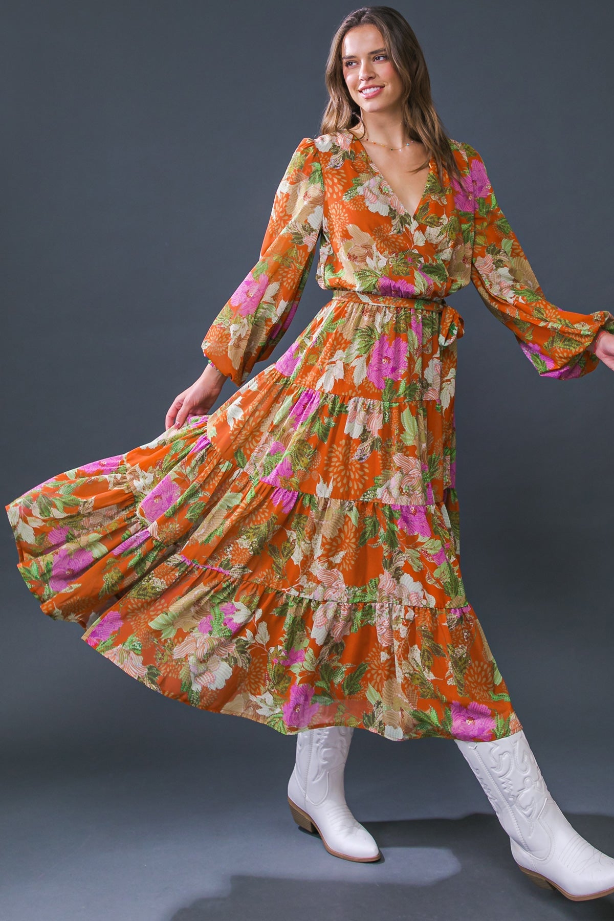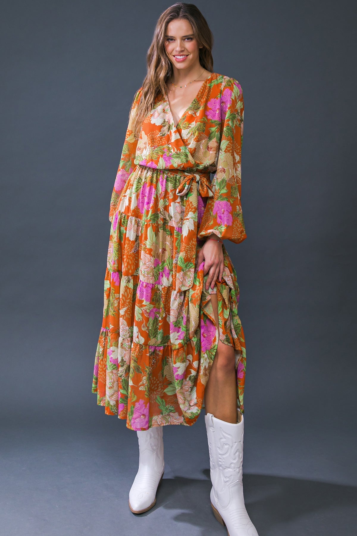 A printed woven midi dress featuring surplice neckline, long sleeve, elasticized waist with self sash tie and tiered skirt