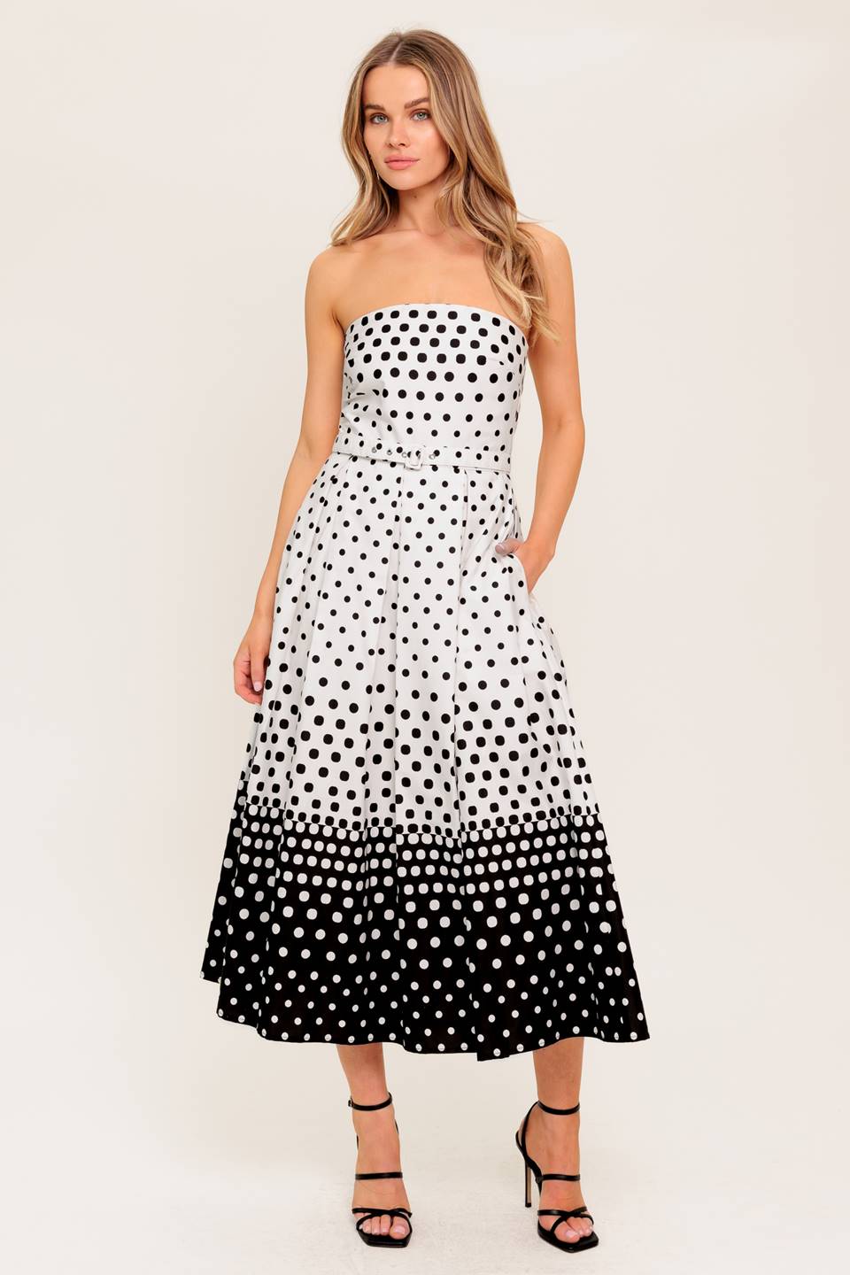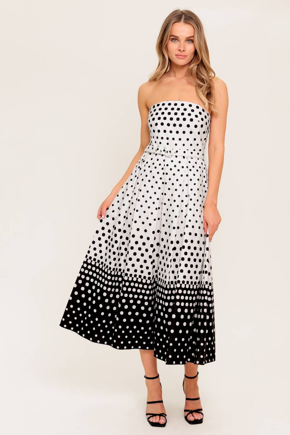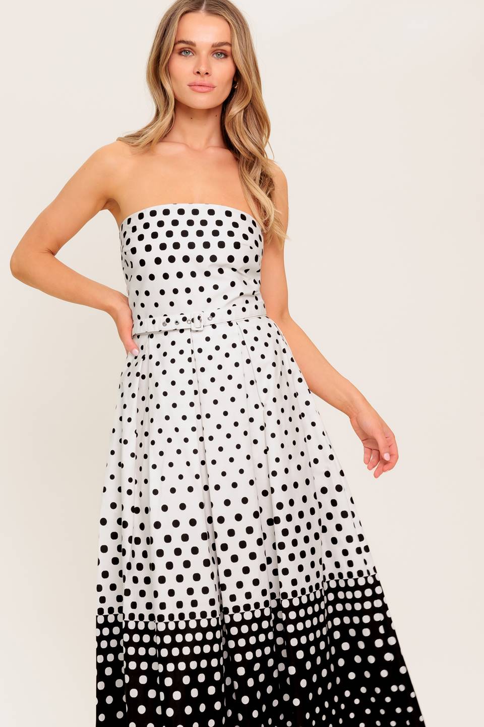 A strapless, polka-dotted printed woven midi dress featuring self belt, full skirt and back zipper closure.