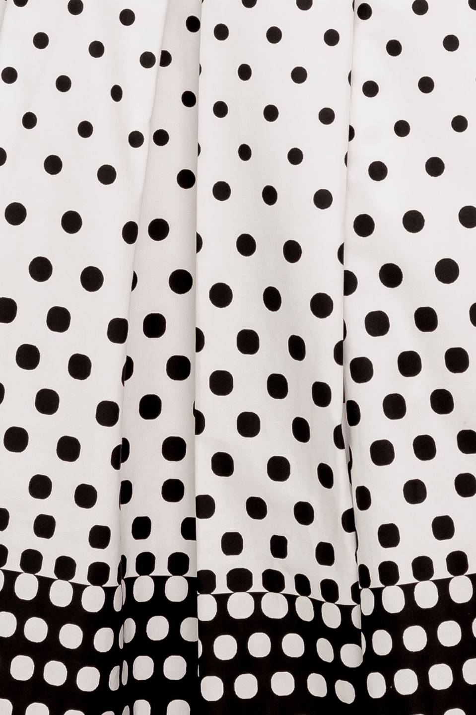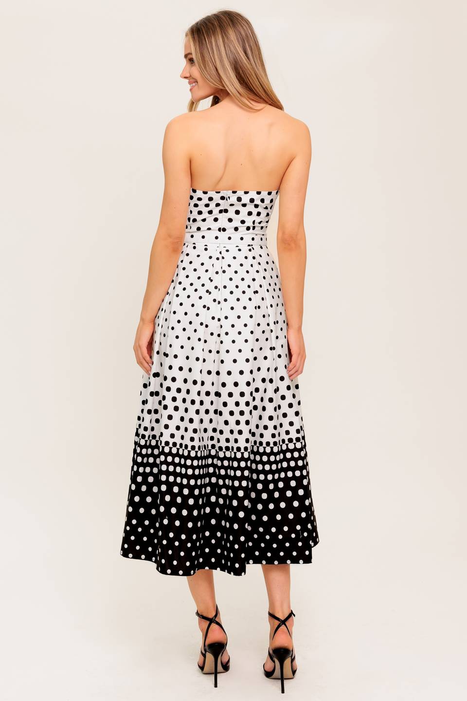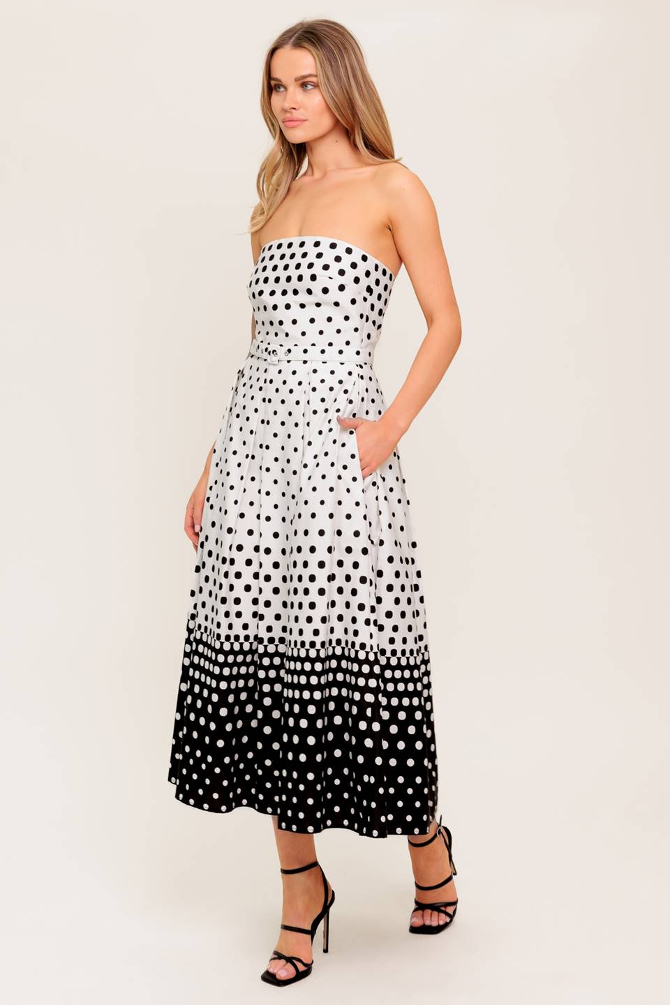 A strapless, polka-dotted printed woven midi dress featuring self belt, full skirt and back zipper closure.