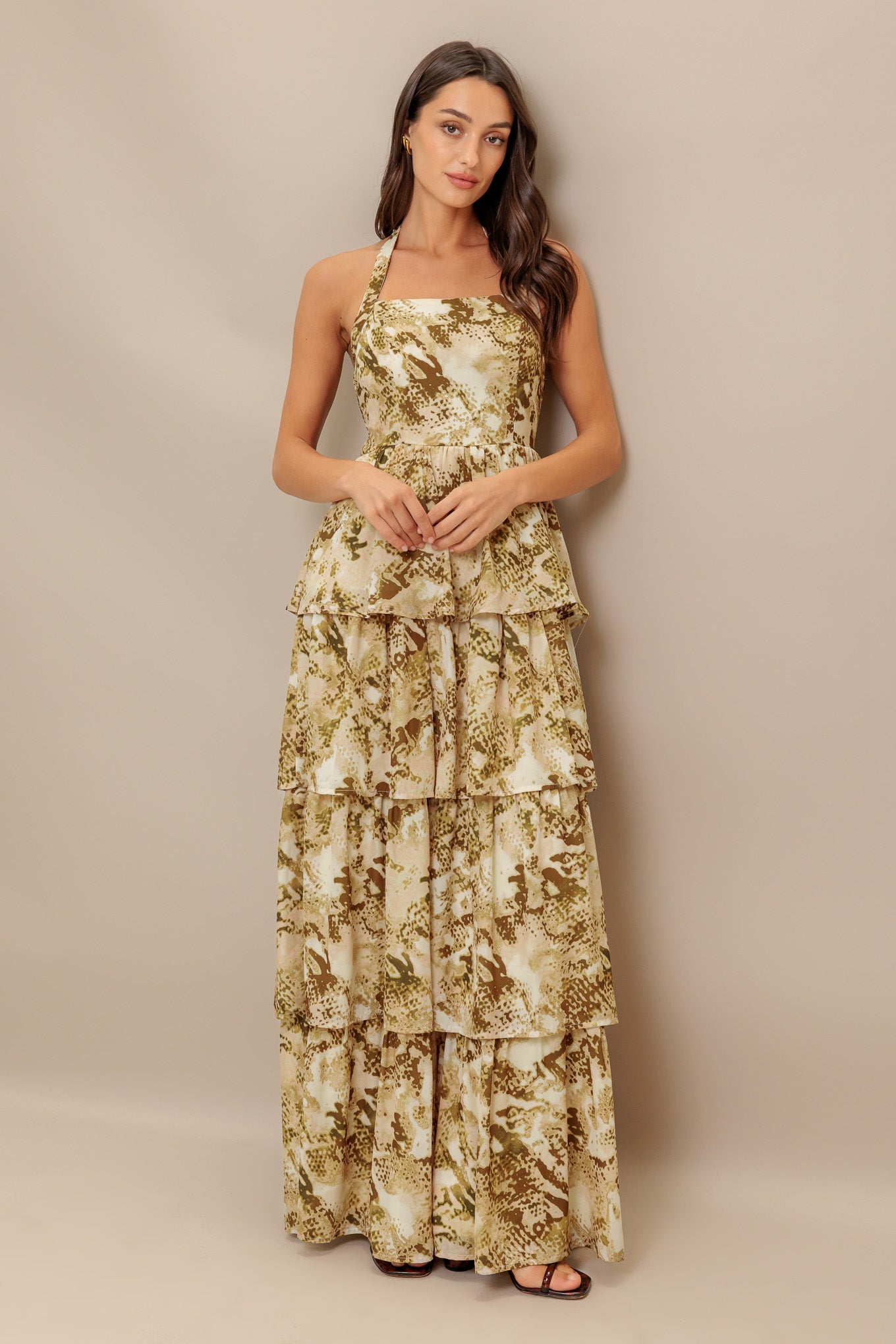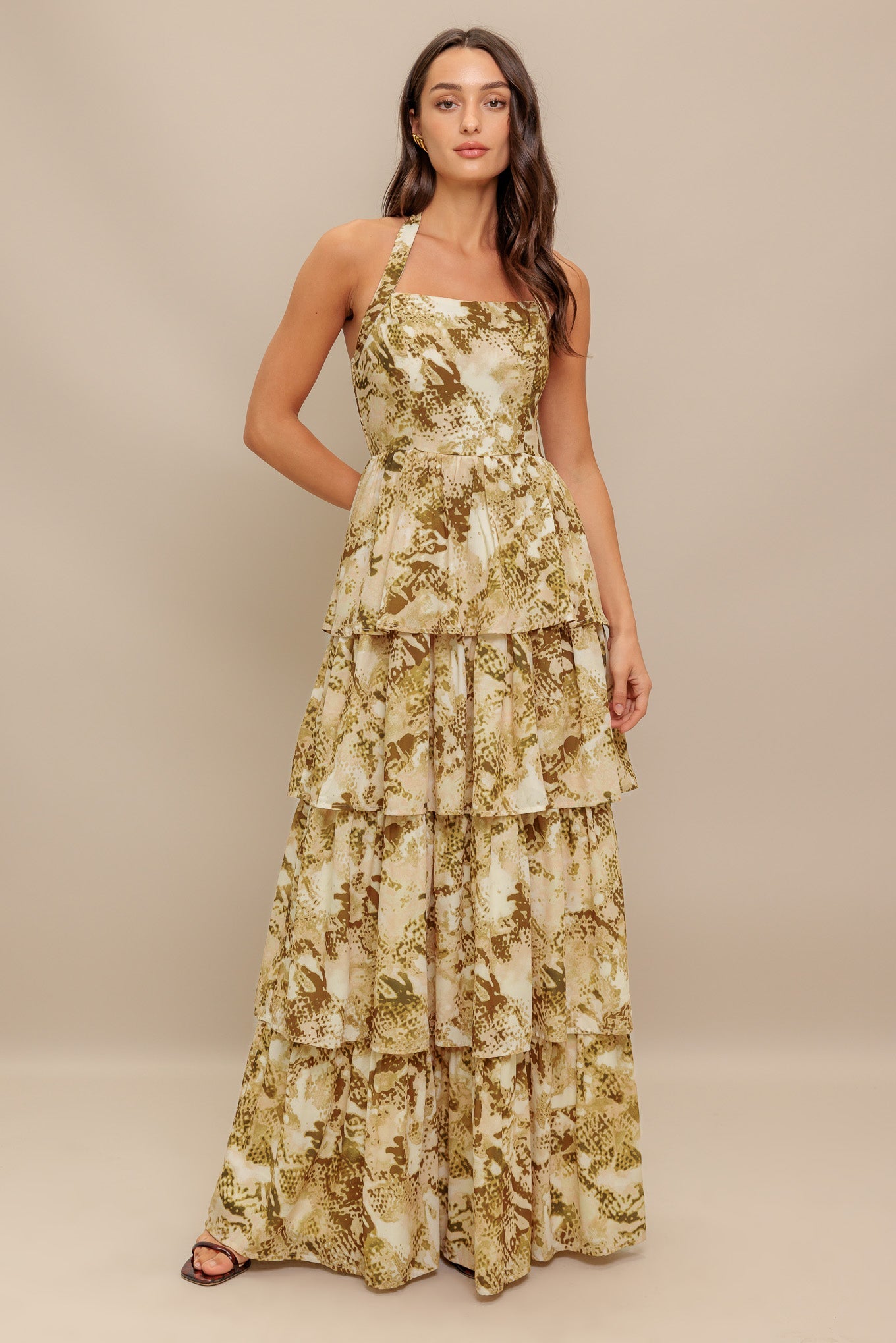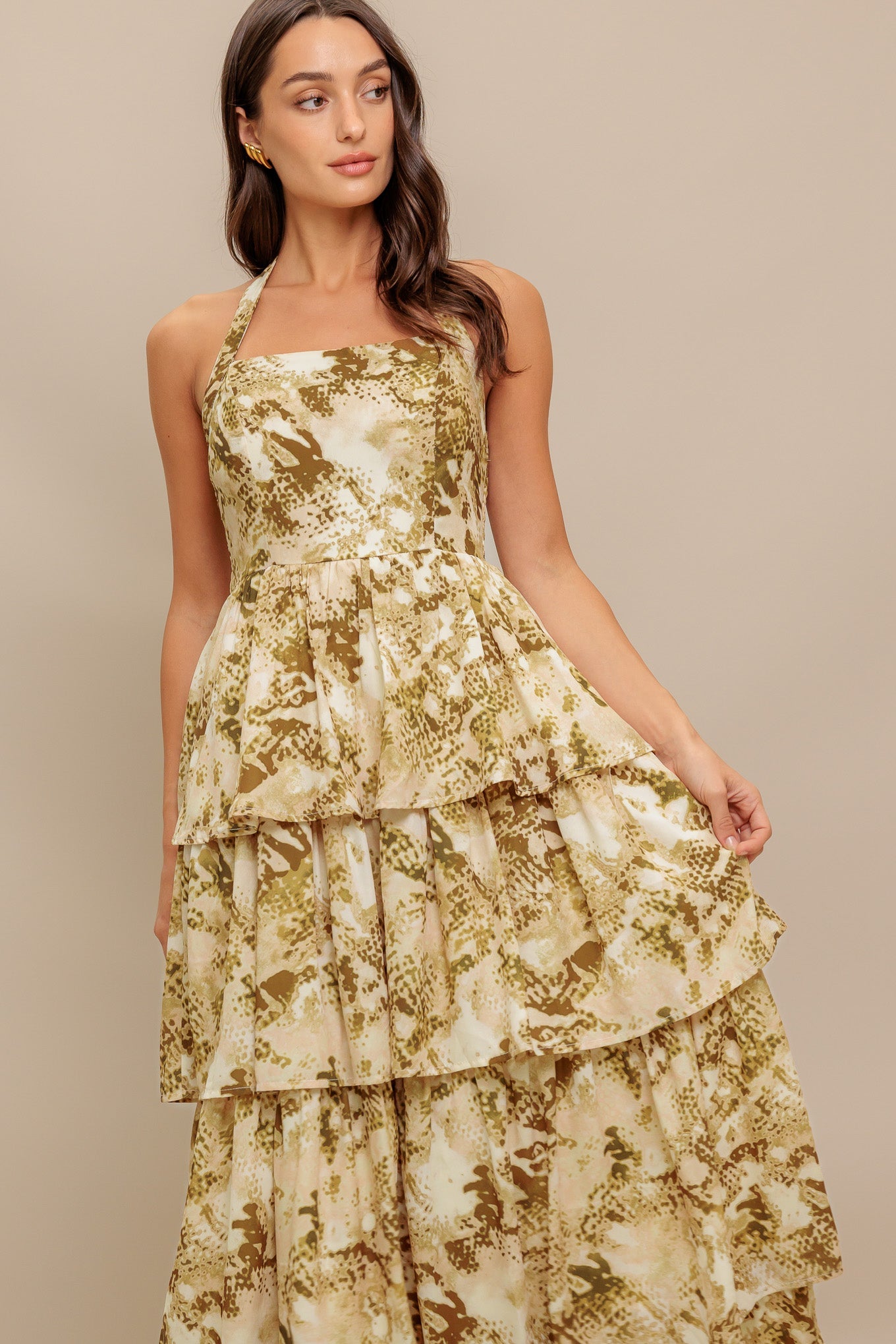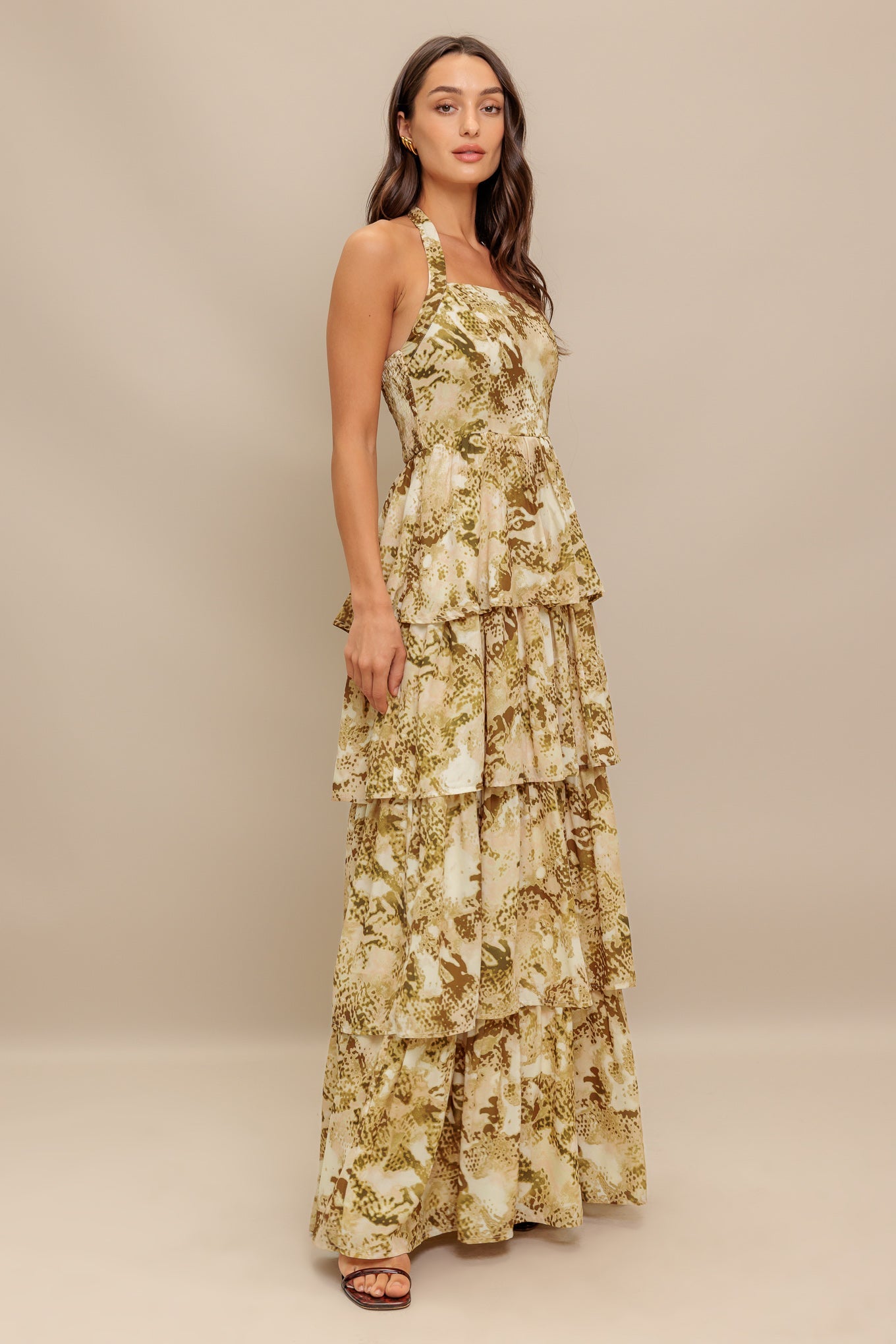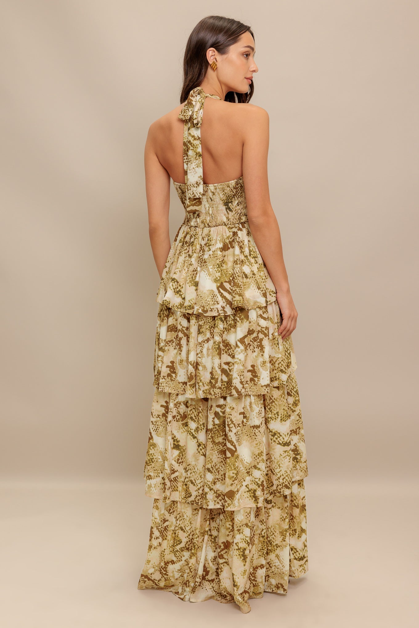 A printed woven maxi dress featuring straight neckline with halter tie, layered skirt and smocked back bodice
