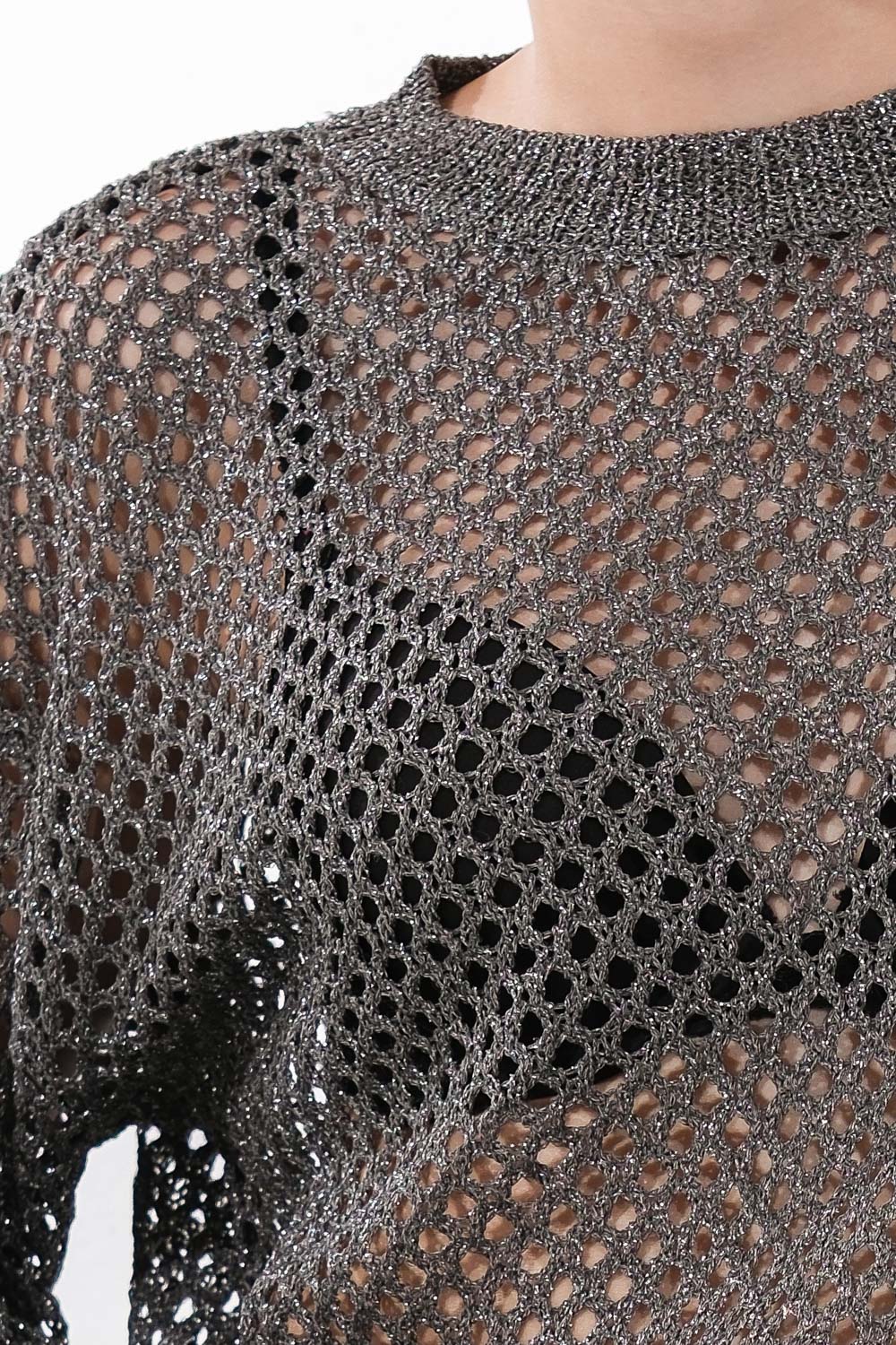 A metallic yarn open knit sweater featuring round neckline and long sleeves