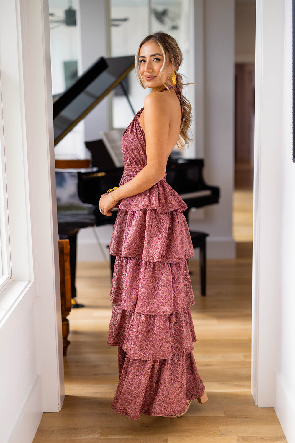 Look captivating in the Talia dress. This maxi dress features a keyhole bust and open back for a flattering fit, plus ruffled tiers and elastic on the back for added comfort. Perfect for any special occasion!