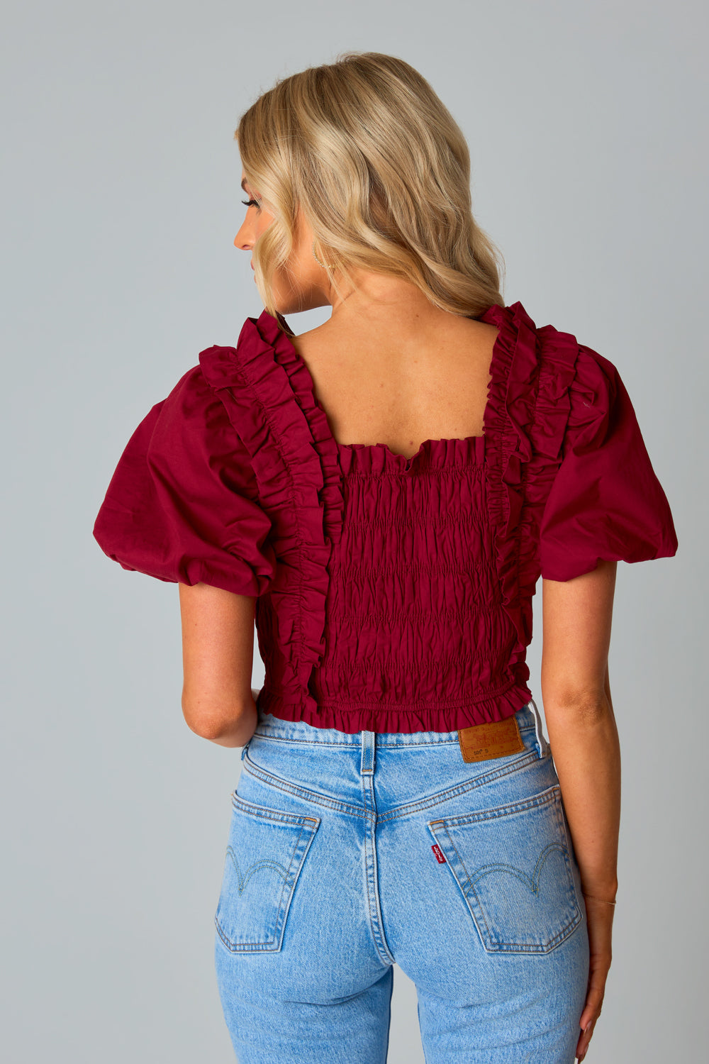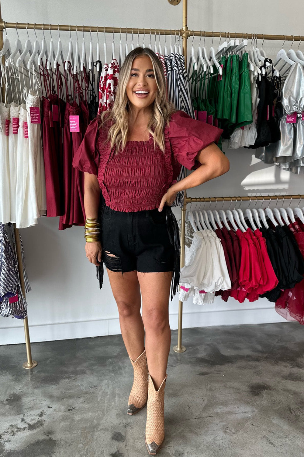 Perfectly girly in this Tandy Top. Cropped and cute. Tandy features shoulder ruffle and puff sleeve, smocked bodice that provides great stretch, and a cropped length. We would style her with our John Skort and Boots for gameday!