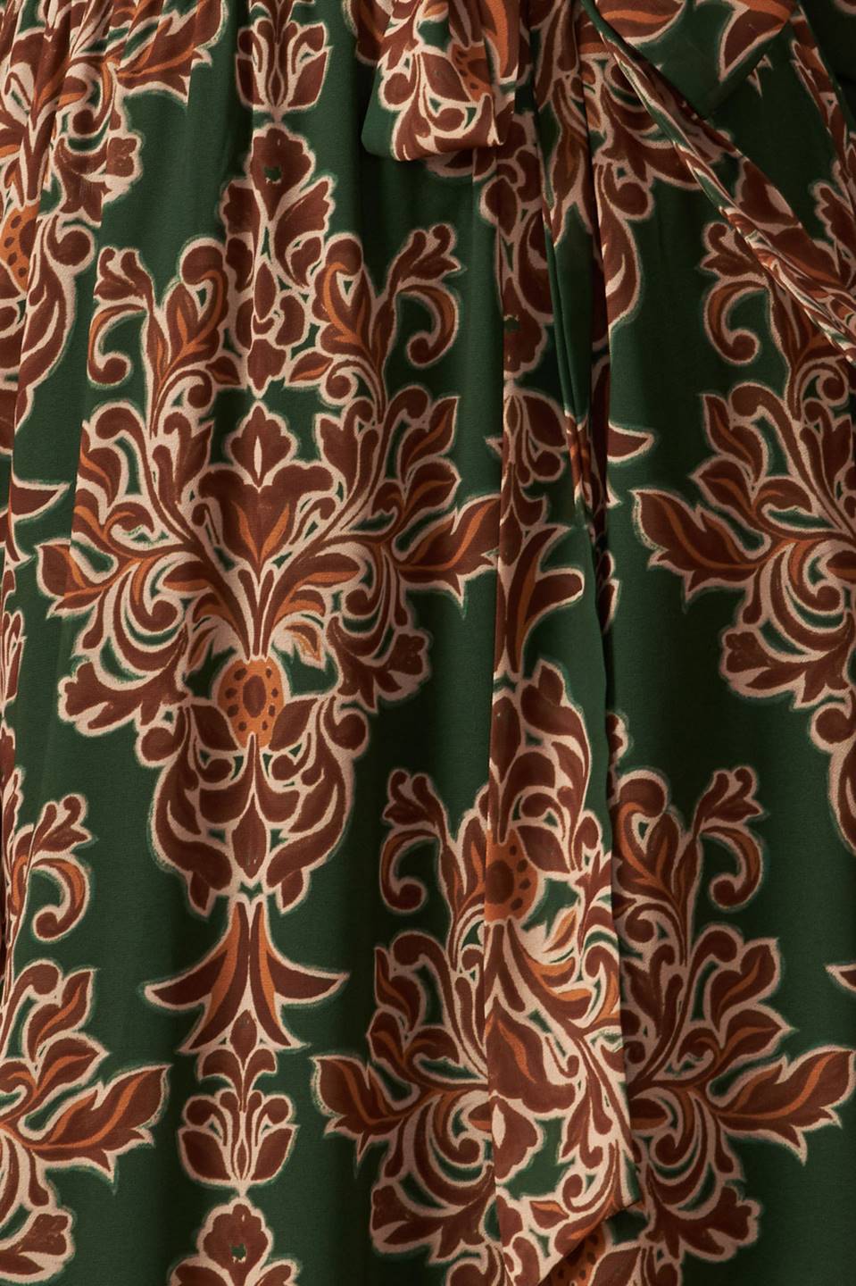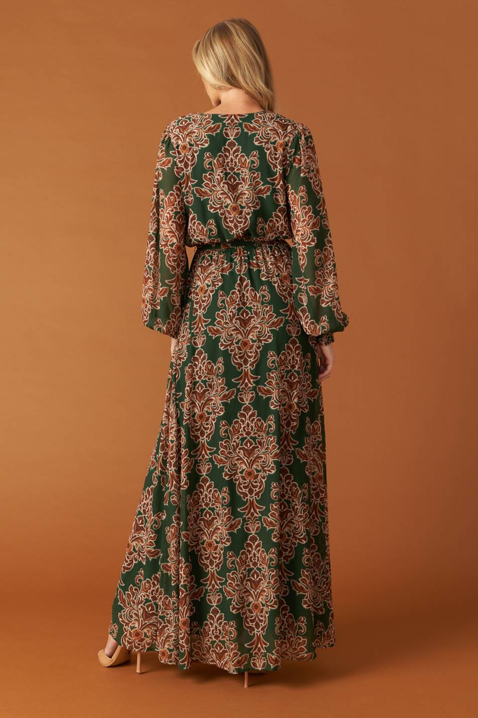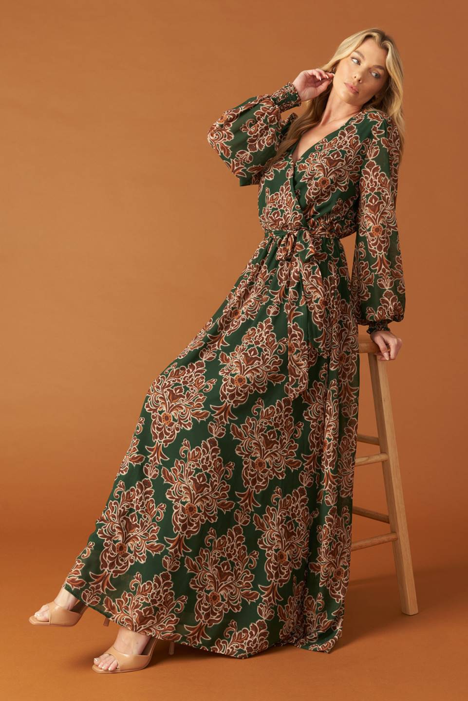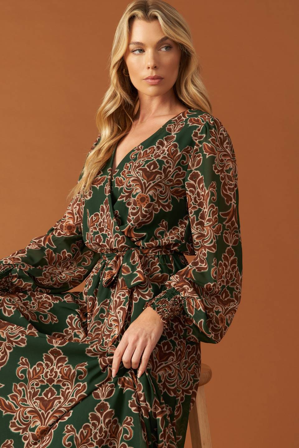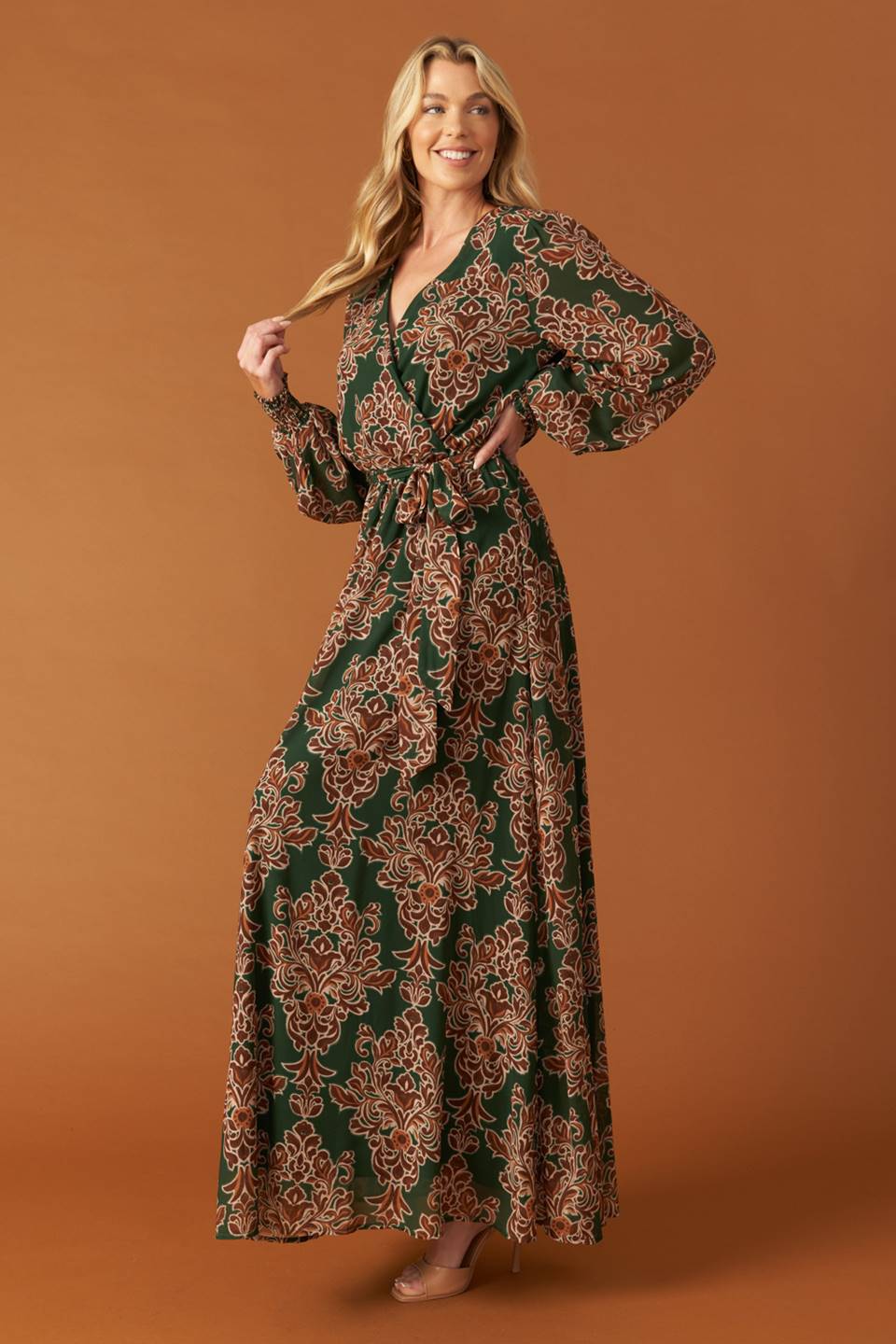 A printed woven maxi dress featuring surplice neckline, long sleeve with smocked cuff, elasticized waist and self sash tie