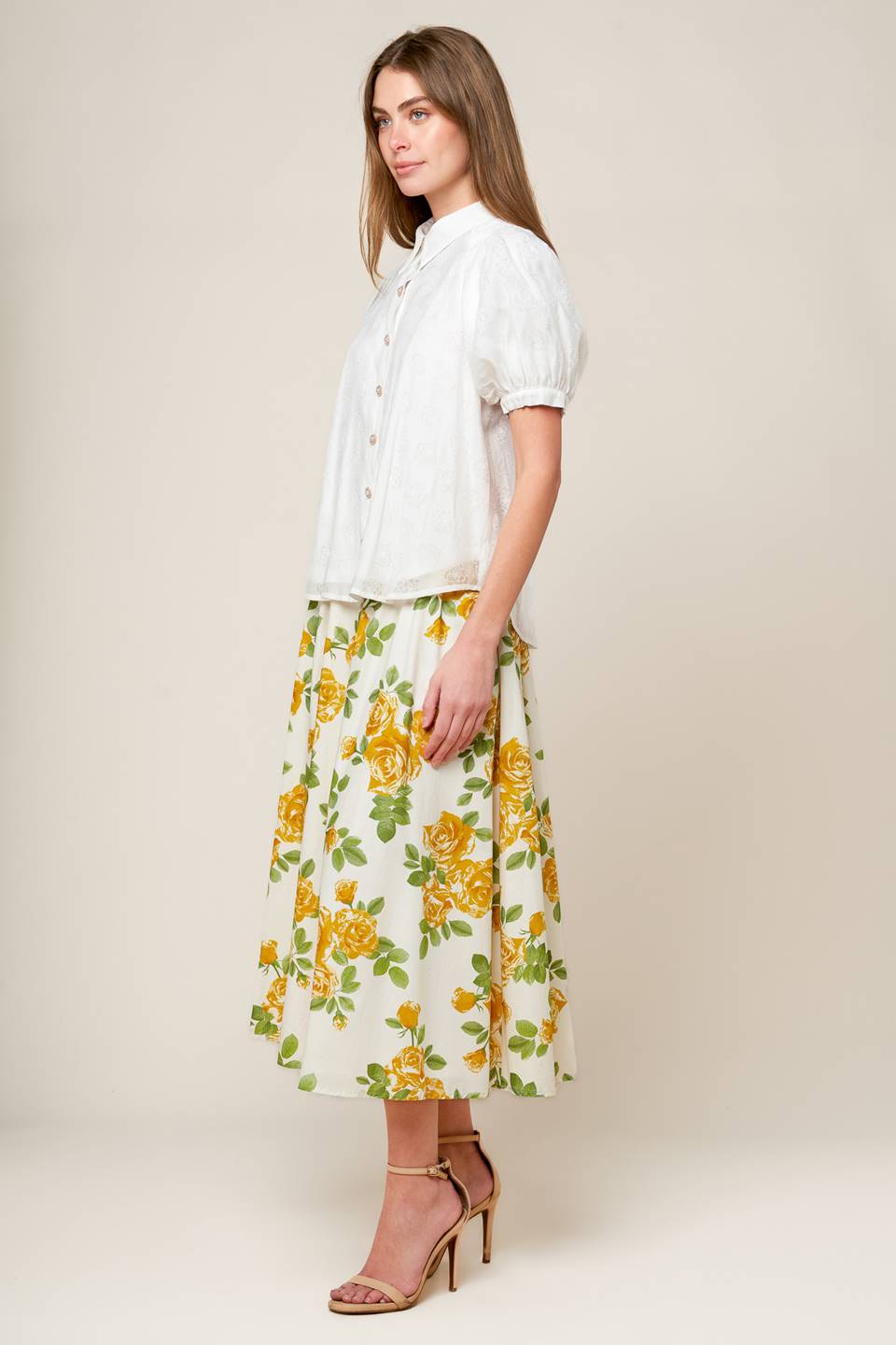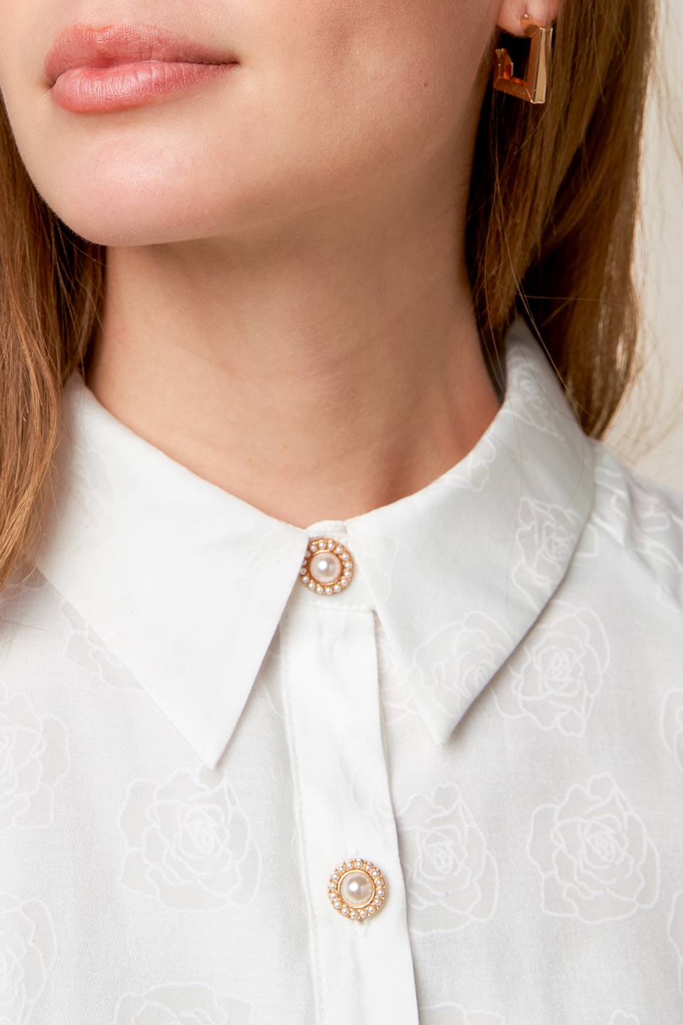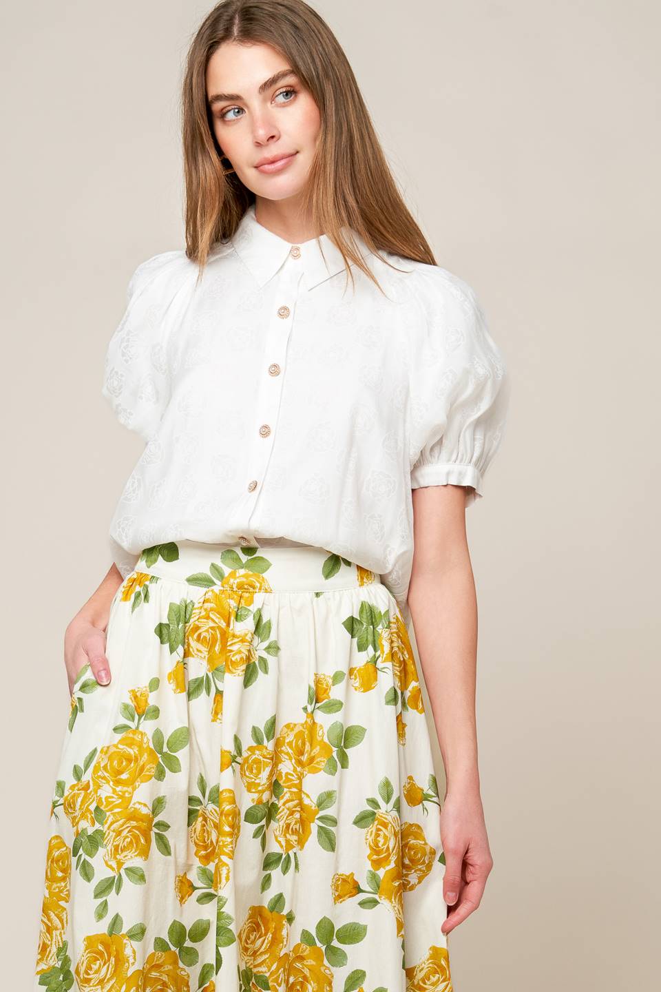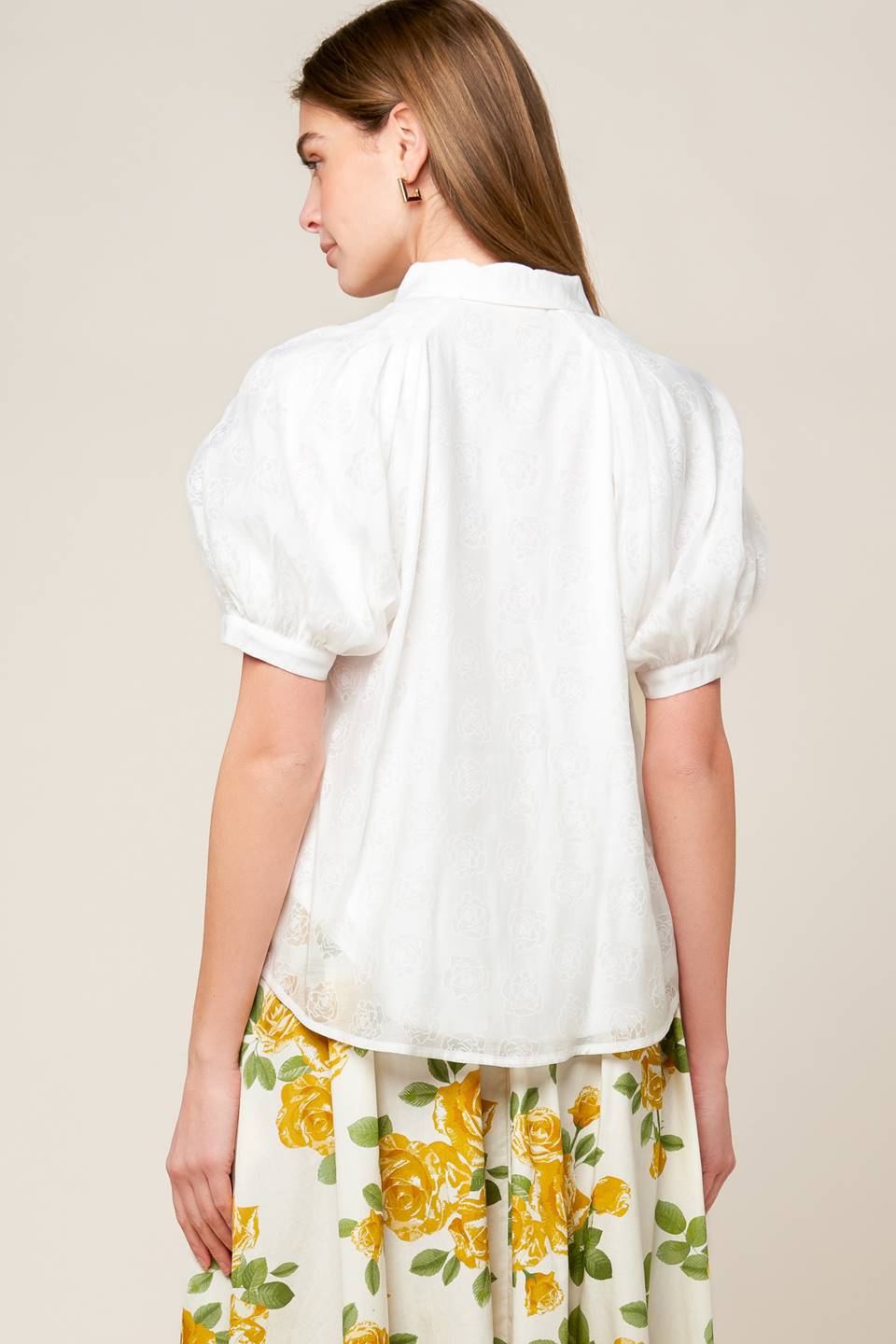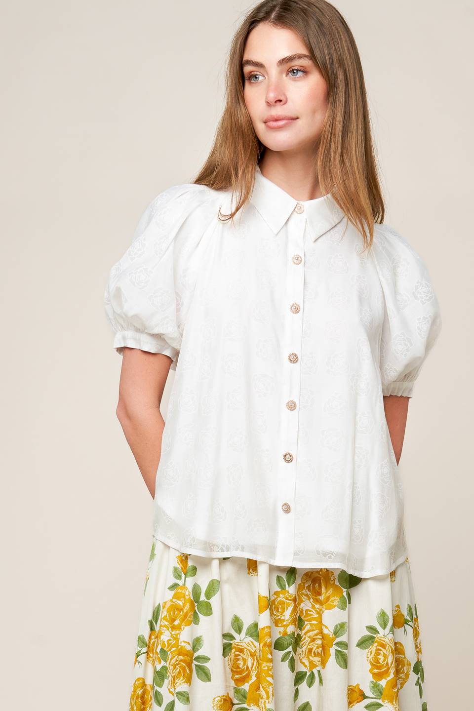 A white textured woven top featuring raglan sleeves and embellished button down.