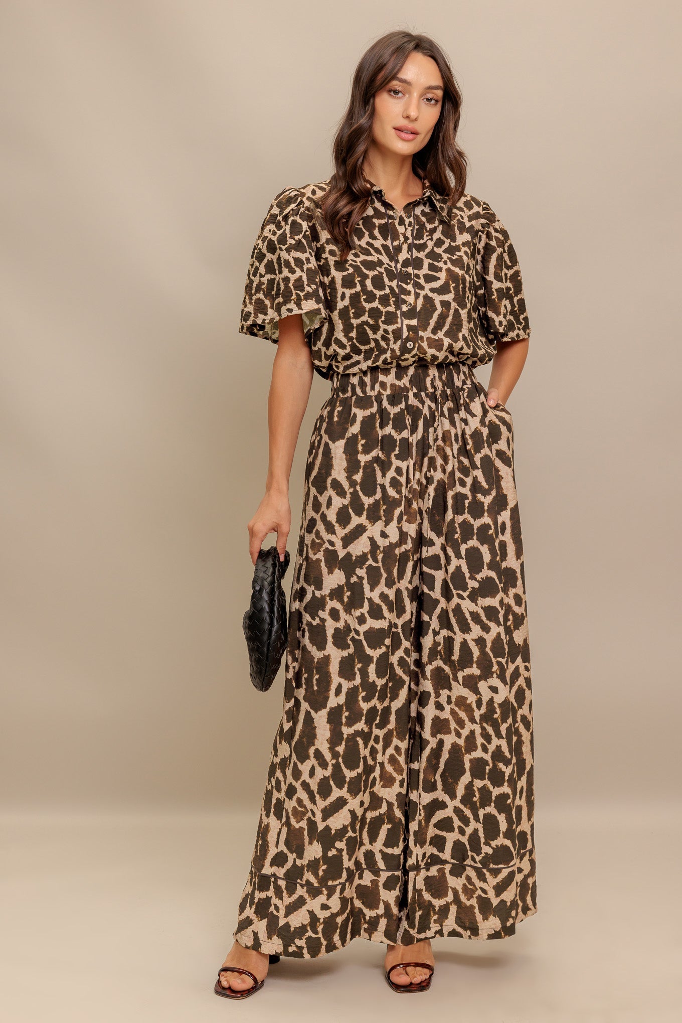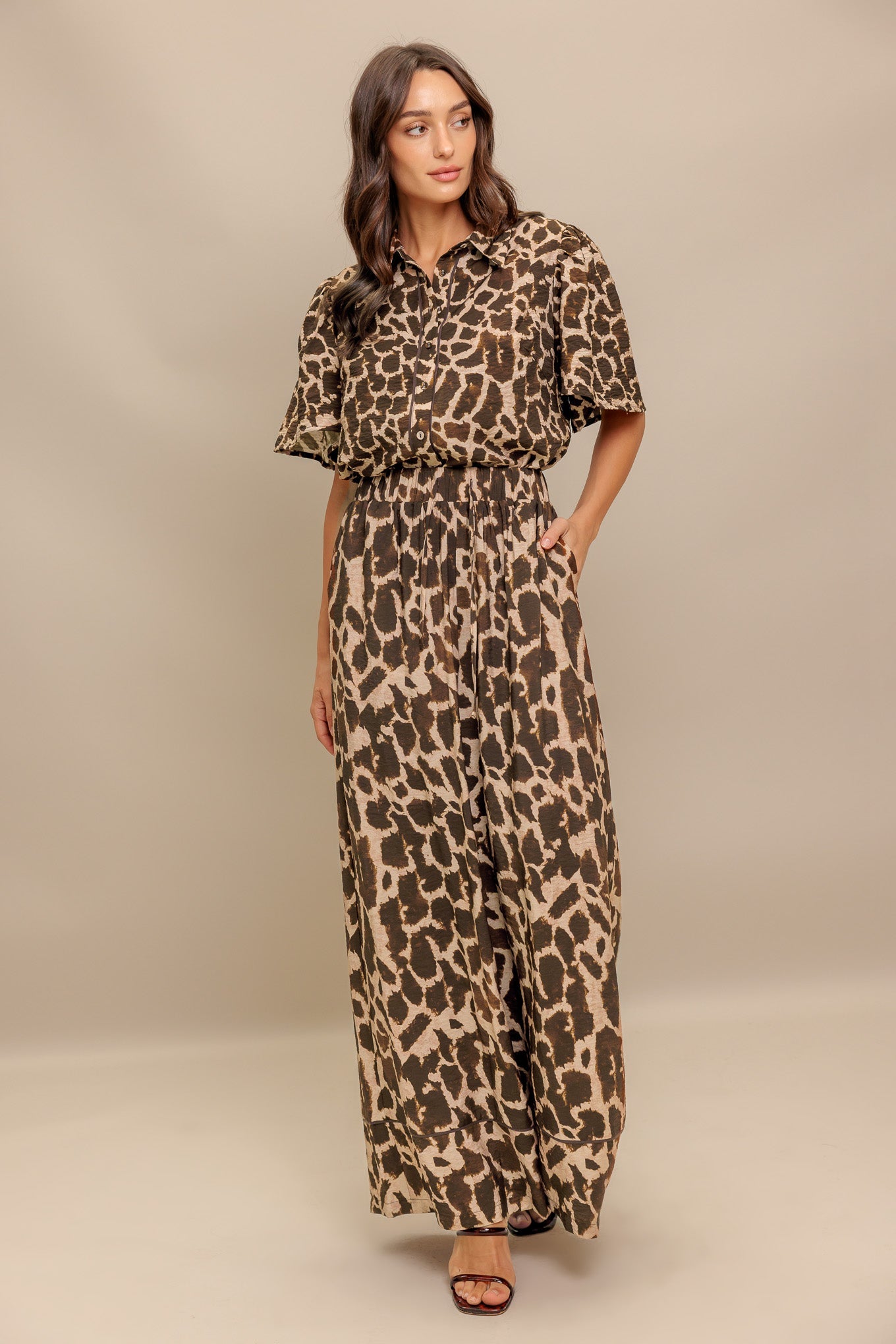 An acid washed denim top featuring round neckline, drop shoulder, long sleeve with cuff, waist band and back button down closure. Matching skirt IK7695