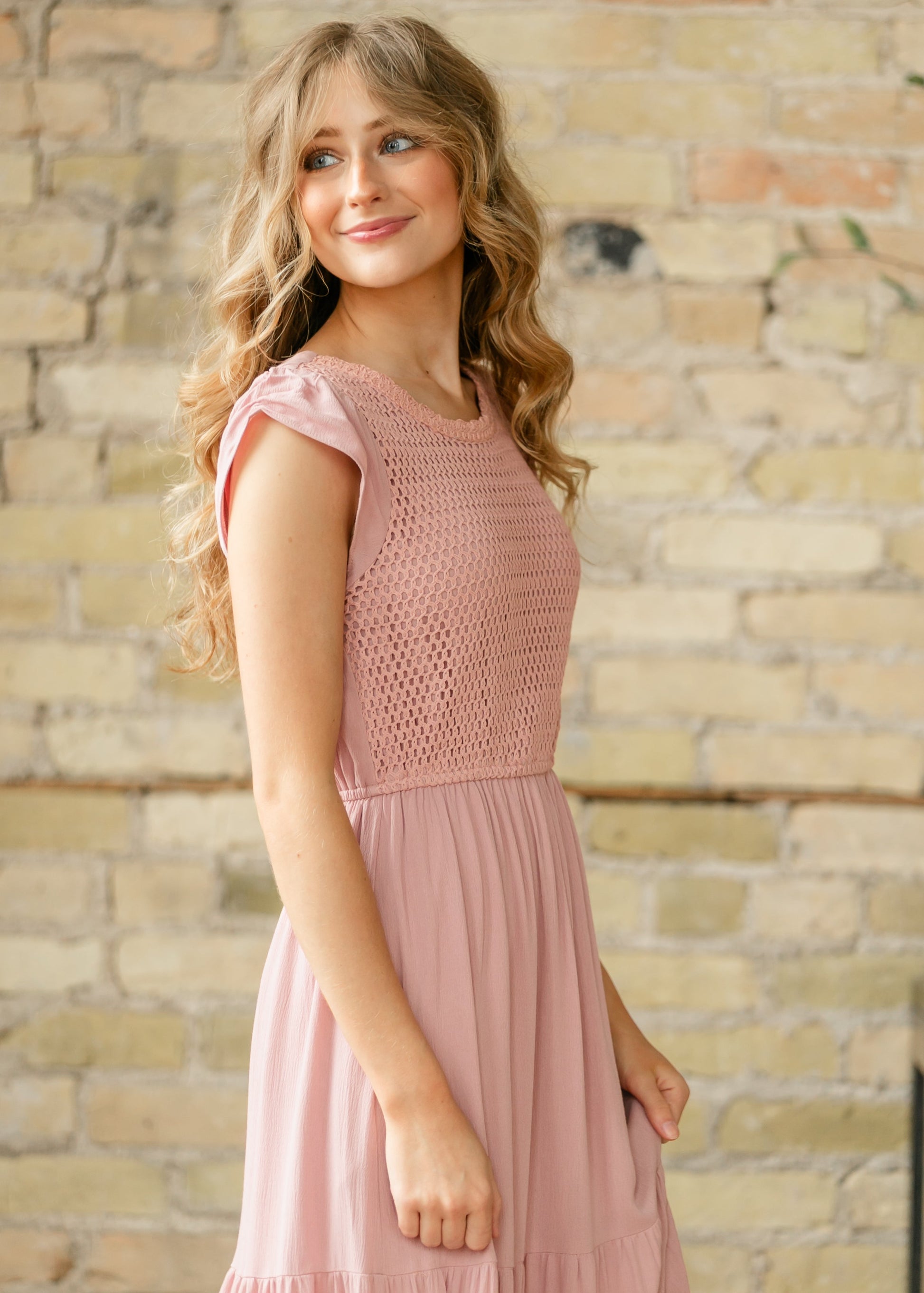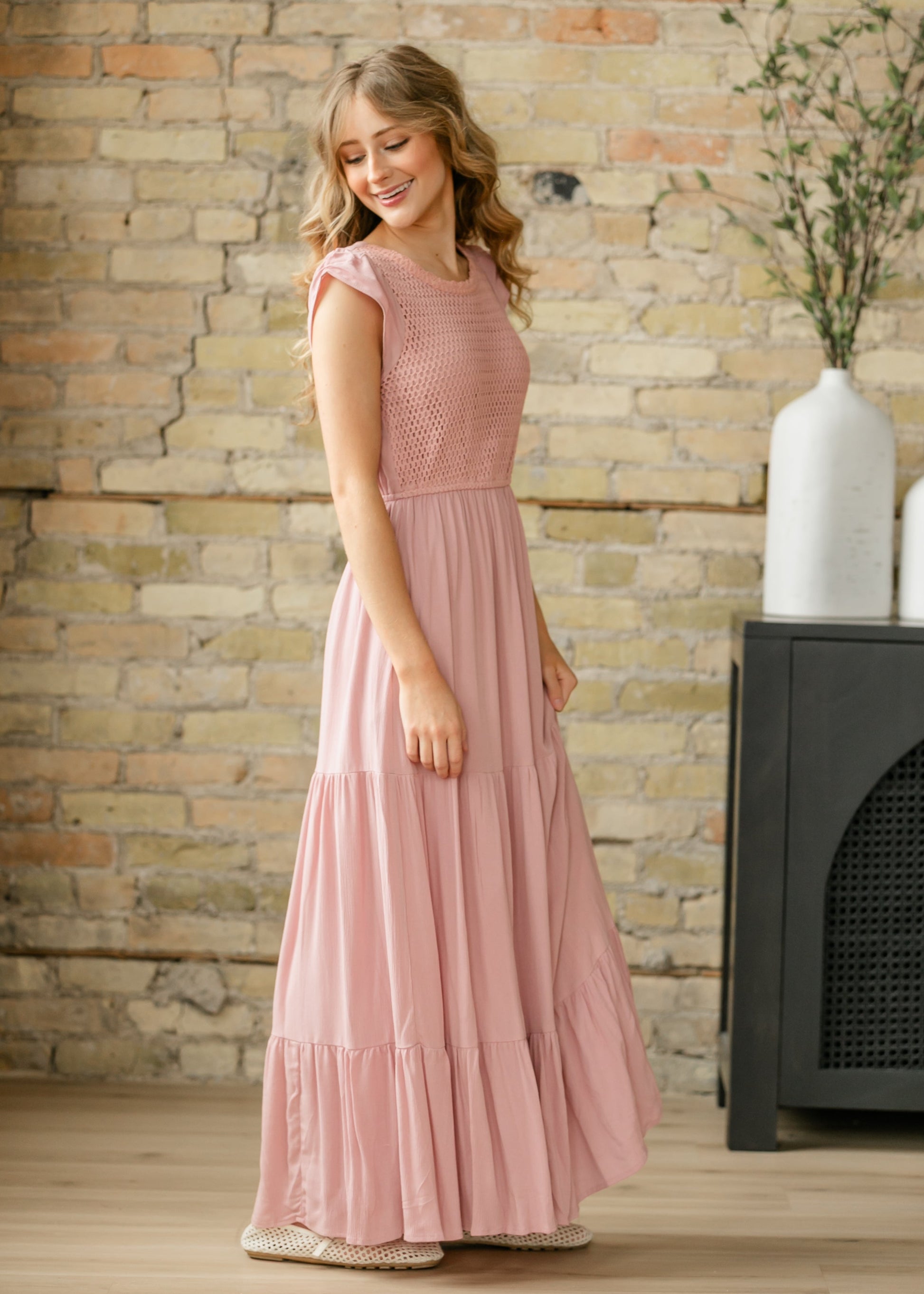 The Willow Mae Crochet Tiered Layer Maxi Dress blends boho charm with effortless elegance. It is Made of soft, breathable fabric and features a flowing tiered skirt, vintage-inspired crochet top, and flattering short sleeves. Fully lined with pockets, this modest style is perfect for warm days, casual outings, or special occasions, where comfort meets timeless, feminine detail!